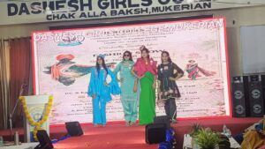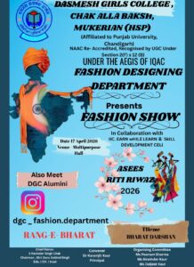 The Fashion Designing Department of Dasmesh Girls College, Mukerian, in collaboration with Earn While Learn Committee, IIC, and VLCC, organized a fashion show titled ‘Asees Riti Riwaz’ under the leadership of Principal Dr. Karamjit Kaur Brar. The event aimed to showcase students’ designs from a commercial perspective.