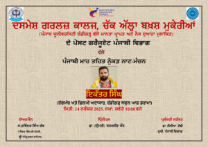 ਦਸਮੇਸ਼ ਗਰਲਜ਼ ਕਾਲਜ ਚੱਕ ਅੱਲ੍ਹਾ ਬਖ਼ਸ਼ ਮੁਕੇਰੀਆਂ ਦੇ ਪੋਸਟ ਗਰੈਜੂਏਟ ਪੰਜਾਬੀ ਵਿਭਾਗ ਦੀ ਵਿਦਿਆਰਥਣ ਸਤਿੰਦਰ ਕੌਰ ਨੇ ਗੁਰੂ ਤੇਗ਼ ਬਹਾਦਰ ਖ਼ਾਲਸਾ ਕਾਲਜ ਫ਼ਾਰ ਵੂਮਨ ਦਸੂਹਾ ਵਿਖੇ ਹੋਏ ਅੰਤਰ ਕਾਲਜ ਕਵਿਤਾ ਉਚਾਰਣ ਮੁਕਾਬਲੇ ਵਿੱਚ ਪਹਿਲਾ ਸਥਾਨ ਹਾਸਲ ਕੀਤਾ ਹੈ।ਕਾਲਜ ਪ੍ਰਿੰਸੀਪਲ ਡਾ.ਕਰਮਜੀਤ ਕੌਰ , ਪੰਜਾਬੀ ਵਿਭਾਗ ਦੇ ਮੁਖੀ ਡਾ.ਸੋਨੀਆ ਦੇਵੀ ਅਤੇ ਸਮੂਹ ਪੰਜਾਬੀ ਵਿਭਾਗ ਵੱਲੋਂ ਵਿਦਿਆਰਥਣ ਨੂੰ ਇਸ ਪ੍ਰਾਪਤੀ ਤੇ ਵਧਾਈ ਦਿੱਤੀ ਗਈ।