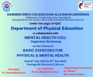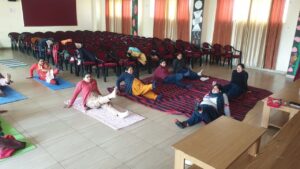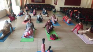 The workshop was conducted by the Resource Person, Dr. Rajwinder Kaur, Department of Physical Education, who provided expert guidance and practical training throughout the programme. The sessions included basic stretching exercises, breathing techniques, light physical workouts, relaxation methods, and mental wellness practices, which could be easily incorporated into daily routines.