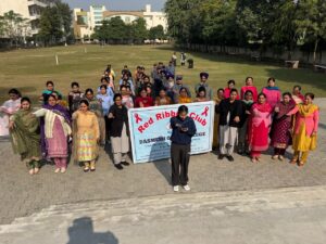 On the occasion of *World AIDS Day, an awareness lecture was organized by the **Red Ribbon Club of Dasmesh Girls College, Chak Alla Baksh, under the mentorship of **Principal Dr. Karamjeet Kaur. The event took place at **G.S.S. School, Dhanoa*, on Dated 02, December 2024 with active participation from both faculty and students.